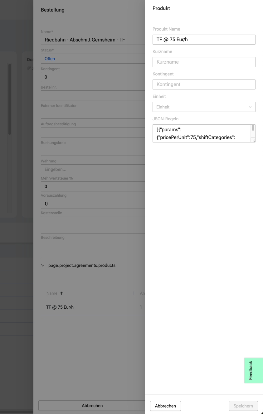 Bestellungen werden künftig nicht mehr direkt mit technischen Regel-Sets verknüpft, sondern mit Produkten. Diese Produkte könnt Ihr bei der Anlage oder Bearbeitung einer Bestellung selbst aus einer bestehenden Liste auswählen und zuweisen. Die im Produkt definierten Preise und Regeln gelten automatisch für alle zugehörigen Aktivitäten und Schichten.