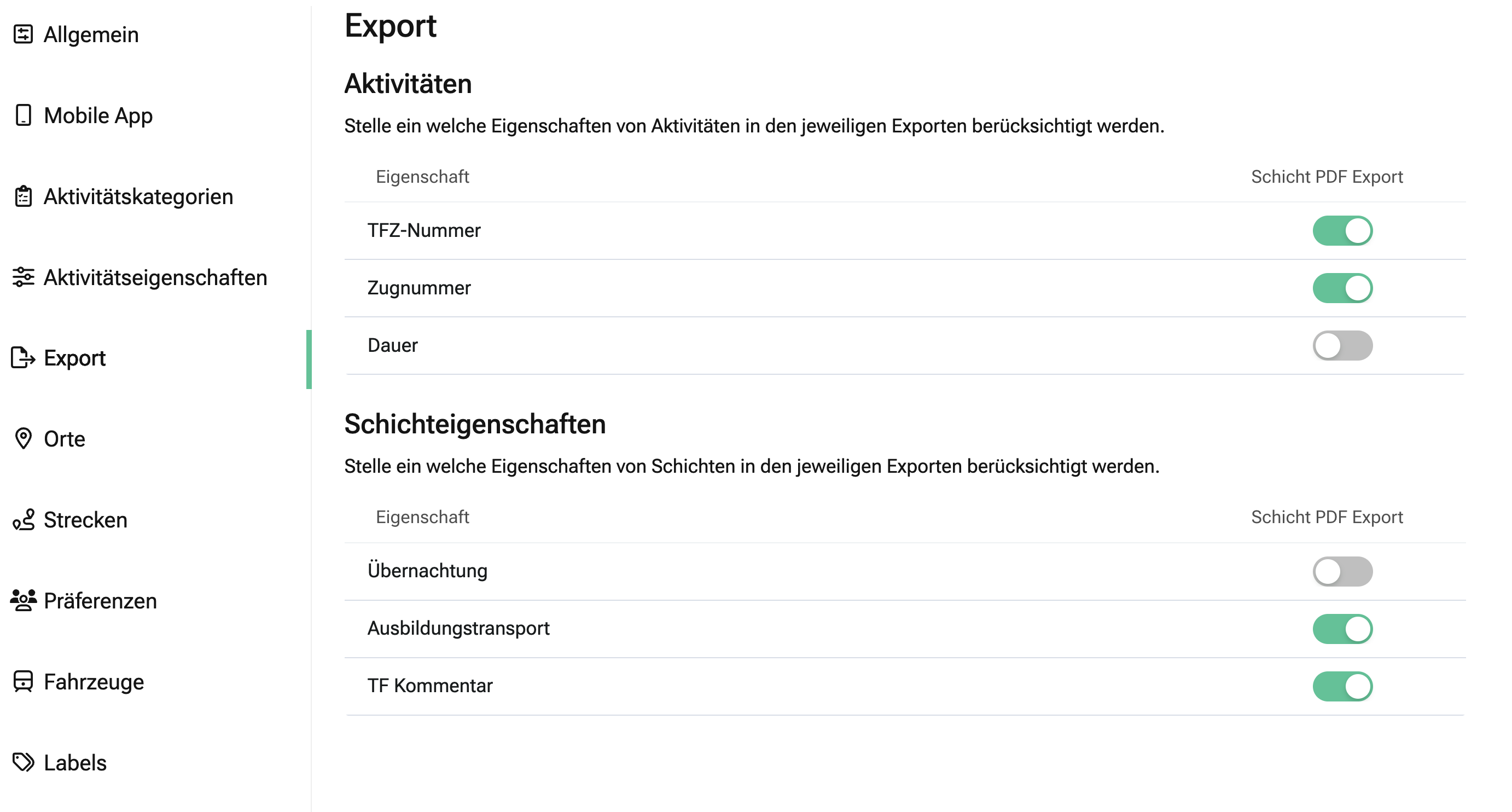 Du kannst jetzt fĂŒr sechs Eigenschaften von AktivitĂ€ten und Schichten individuell festlegen, ob deren Werte im Schicht-PDF-Export enthalten sein sollen oder nicht.